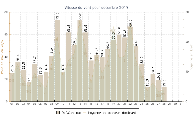 | min | max | moy | Vitesse (rafales) | Secteur | ||